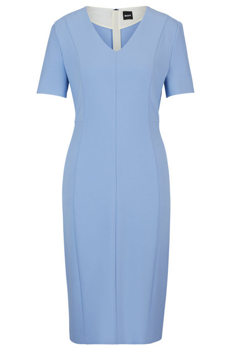 A slim-fitting business dress by BOSS Womenswear. This short-sleeved design is crafted in stretch fabric and features a V neckline. This product is made with cellulose fibres, derived from natural raw wood material and sourced from responsibly managed forests. We cooperate with external organisations to ensure respectful treatment of virgin and endangered forests.